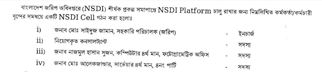 নিন্মে বর্ণিত ব্যক্তিবর্গগণকে এনএসডিআই প্রজেক্ট কার্যক্রমের দায়িত্ব অর্পণ করা হয়েছে